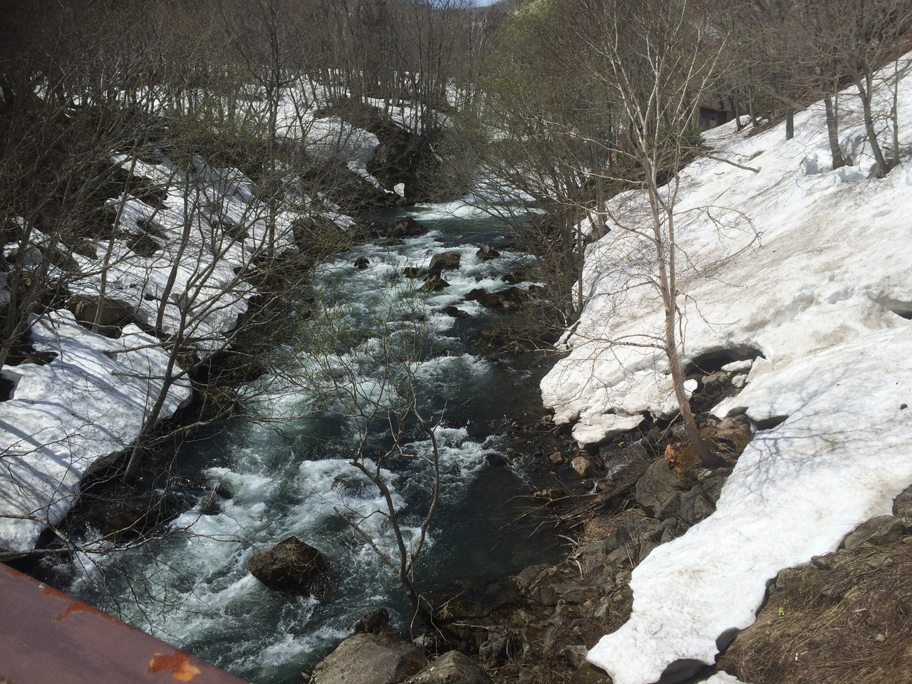 熊の湯の看板周辺に駐車スペースがありますので、そこから橋を渡って温泉へ。