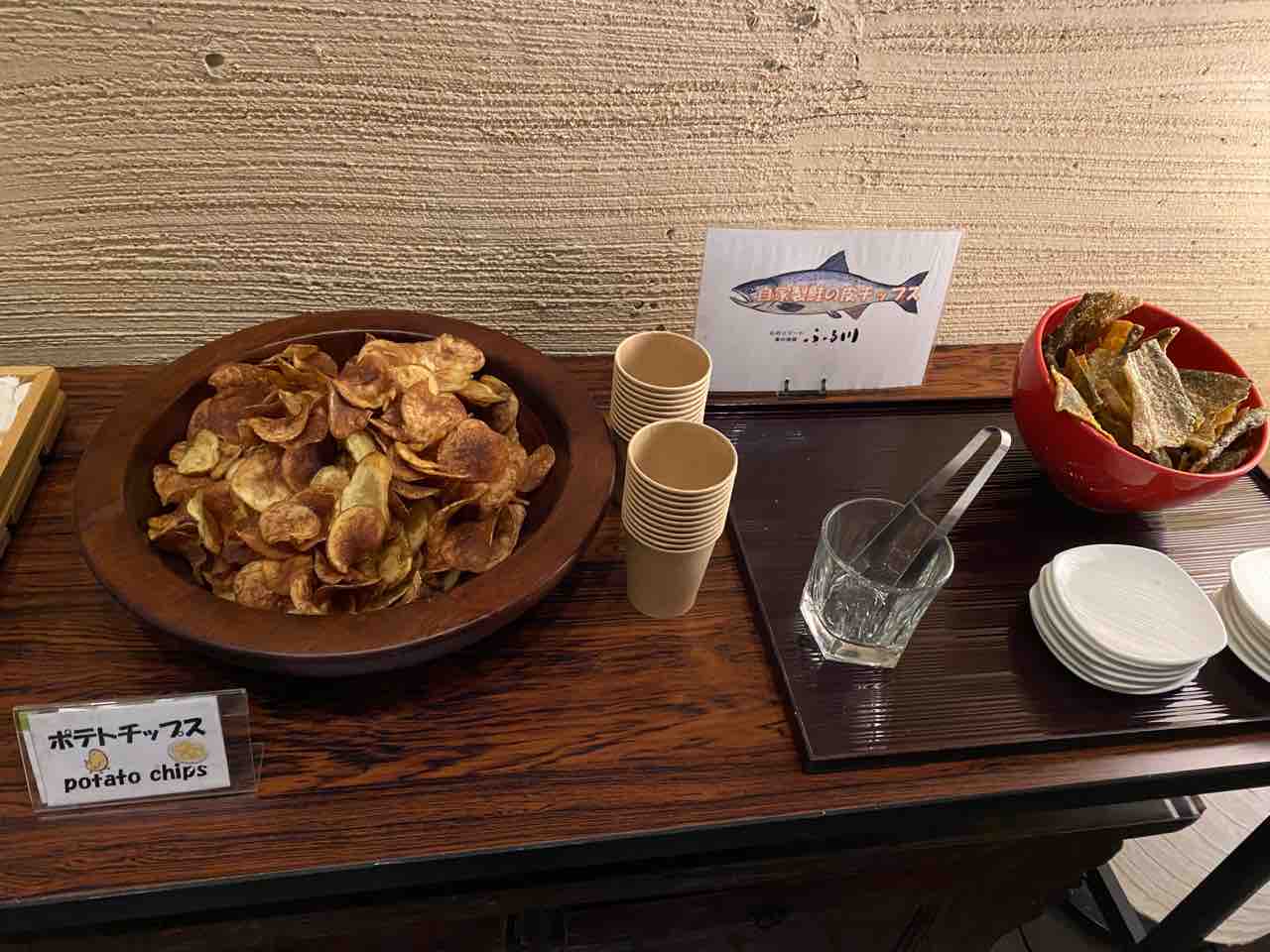 自家製ポテトチップスや鮭皮チップスがツマミとして置いてあります。