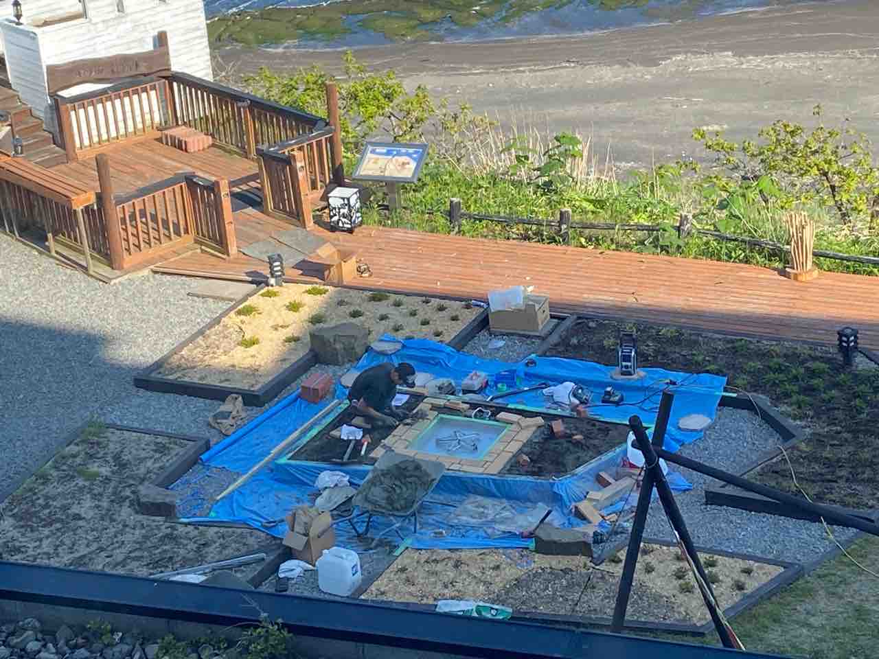 部屋から外を見ると何やらテラスで作業をしています。