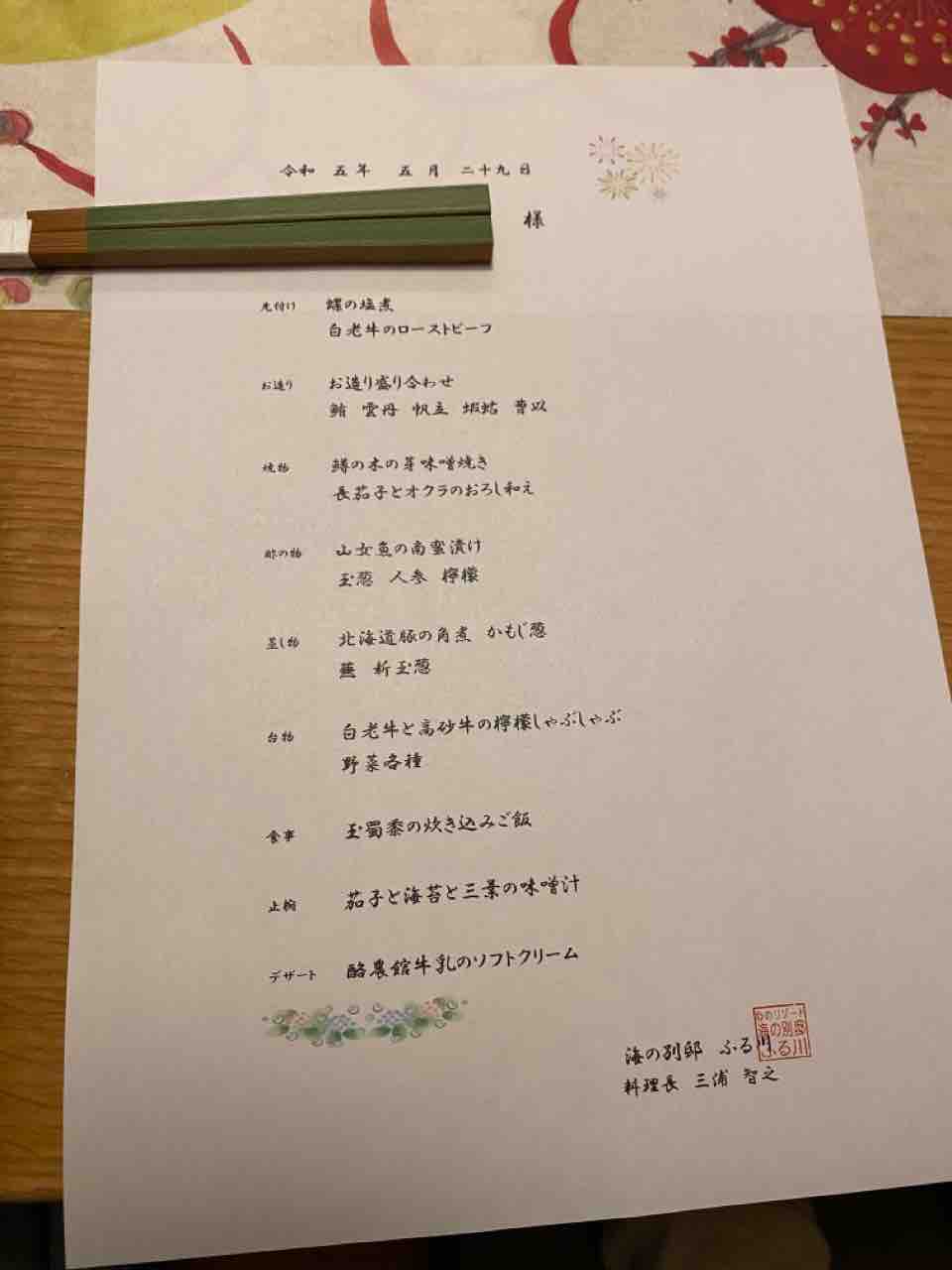2泊目は全員に出る内容ではなく、別メニューなので個人名が入っていました。