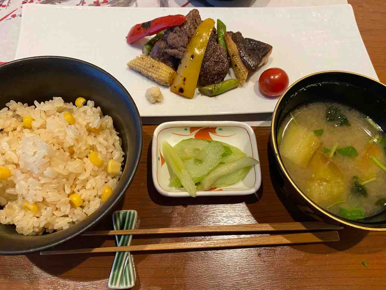 食べやすい程度の脂身で、一緒に焼いているヤングコーンまで旨い。